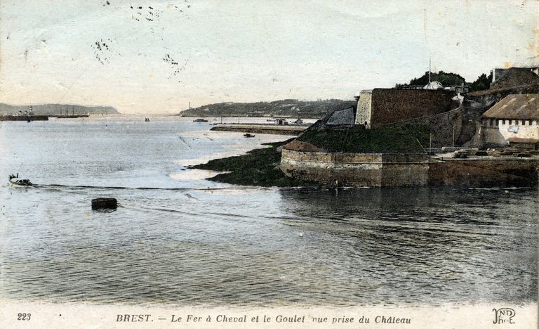 Vue de Brest : embouchure fortifiée de la Penfeld : batterie du Fer à Cheval. En arrière-plan : le goulet de Brest et le phare du Portzic. Carte postale (N.D. Phot.)Immatriculation