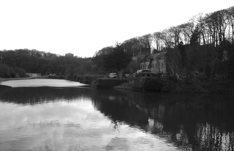 Vue de situation depuis le nord en 2005 : au premier plan, la Penfeld ; le quai et la cale de Kervallon sont dominés par la demeure dite "Maison du corsaire"Immatriculation