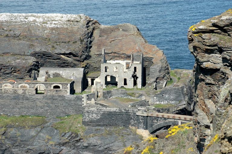 Vue de l'îlot des Capucins : on distingue de gauche à droite : une caserne, l'usine électrique voûtée, la maison du gardien à un étage et combles et l'escalier sous roc permettant l'accès à la batterie de rupture située dans le rocher au ras de l'eauImmatriculation