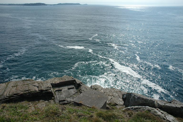 Vue générale des deux abris orientés vers l'anse de Camaret : l'un, arasé pour un projecteur de 150 cm, le deuxième pour une installation photo-électriqueImmatriculation