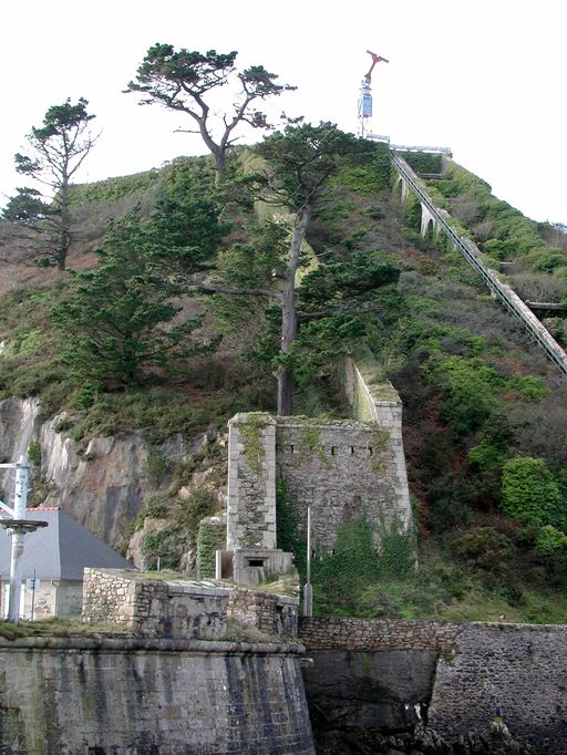 Vue du fort du Mengant depuis le môle construit en 1877 : entrée de la batterie basse flanquée par la branche tombante, funiculaireImmatriculation