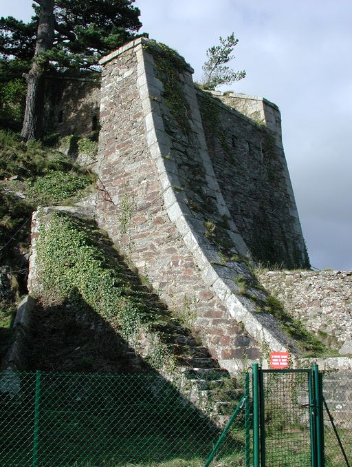 Vue du fort du Mengant : mur d'enceinte dit branche tombante percée de créneaux de mousqueterie et escalier parallèleImmatriculation