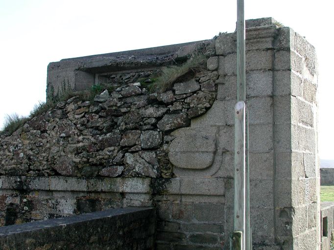 Vue du fort du Mengant : pilier d'entrée de la batterie basse intégré dans un ouvrage bétonné allemand protégeant l'entréeImmatriculation
