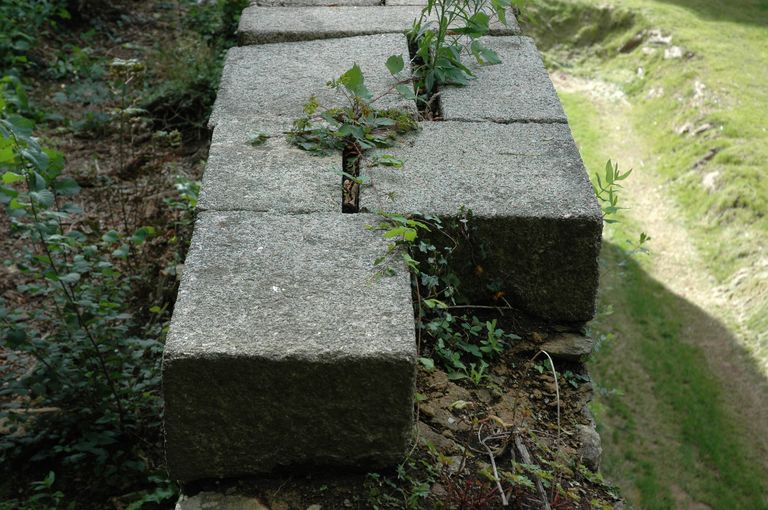 Vue de l'ouvrage à cornes de Quéliverzan : couronnement du parapet des créneaux de fusilladeImmatriculation