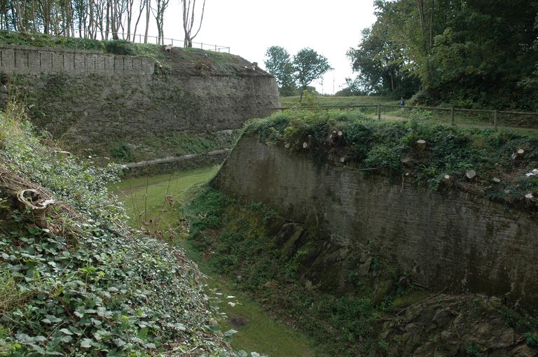 Vue de l'ouvrage à cornes de Quéliverzan : fossé sec, escarpe et contrescarpeImmatriculation