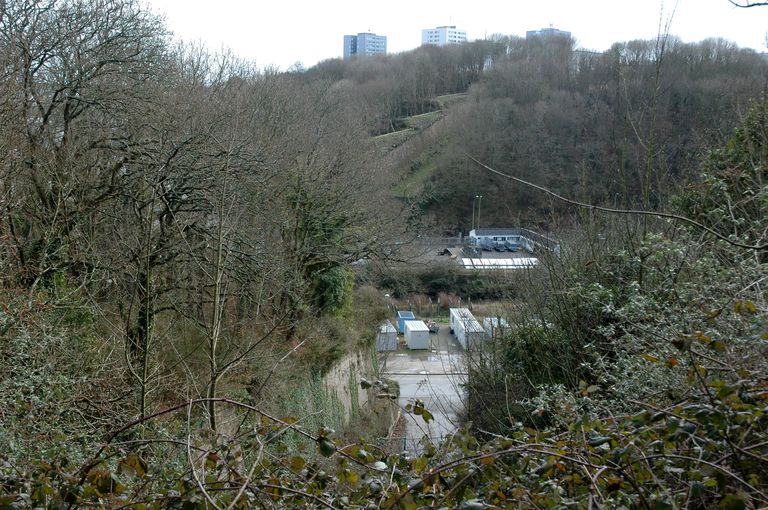 Vue de l'ouvrage à cornes de Quéliverzan depuis la rive opposée de la Penfeld : plateformes d'artillerie en escalierImmatriculation
