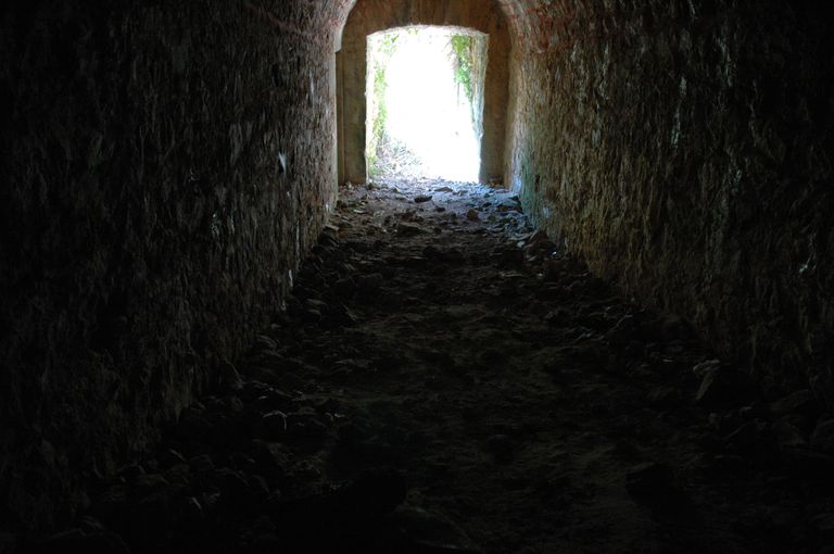 Vue générale des lignes de Quélern : vue du couloir de la poterne dite de secours de la porte principale menant au péristyleImmatriculation