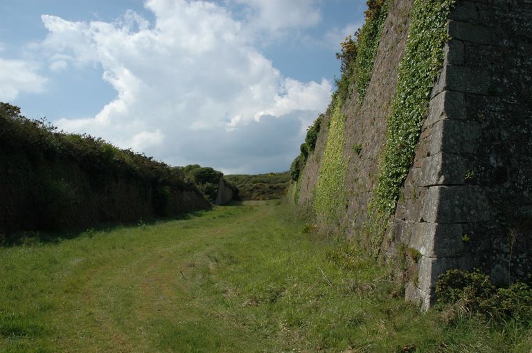 Vue générale des lignes de Quélern : fossé sec de la demi-lune ouestImmatriculation