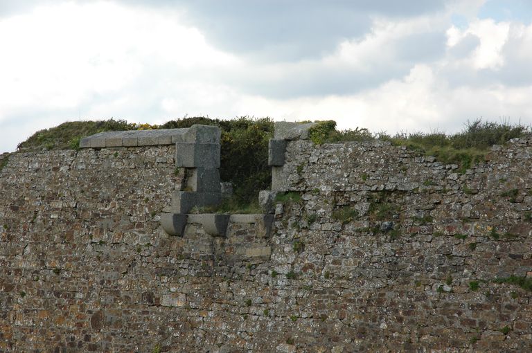 Vue des lignes de Quélern : flanc occidental du demi-bastion ouest, bretèche flanquant le pied du rempart et le fossé secImmatriculation