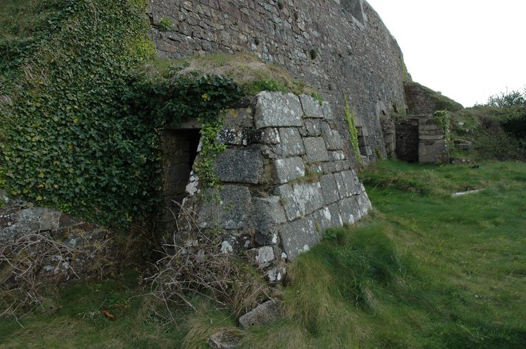 Vue des lignes de Quélern : rempart regroupant le corps de garde et le magasin à poudre de la batterie de côte ouest. Mur de protection de l'entrée probablement construit durant la Seconde Guerre Mondiale (?)Immatriculation
