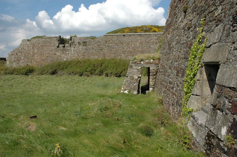 Vue des lignes de Quélern : entrée des casernements de la batterie de côte ouest (remaniée durant la Seconde Guerre Mondiale)Immatriculation