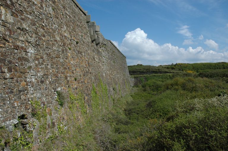 Vue des lignes de Quélern : flanc occidental du demi-bastion ouest, bretèche flanquant le pied du rempart et le fossé secImmatriculation
