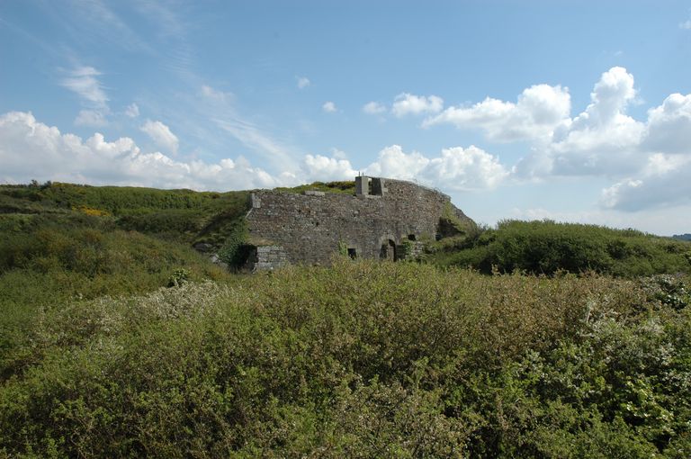 Vue des lignes de Quélern : rempart regroupant le corps de garde et le magasin à poudre de la batterie de côte ouestImmatriculation