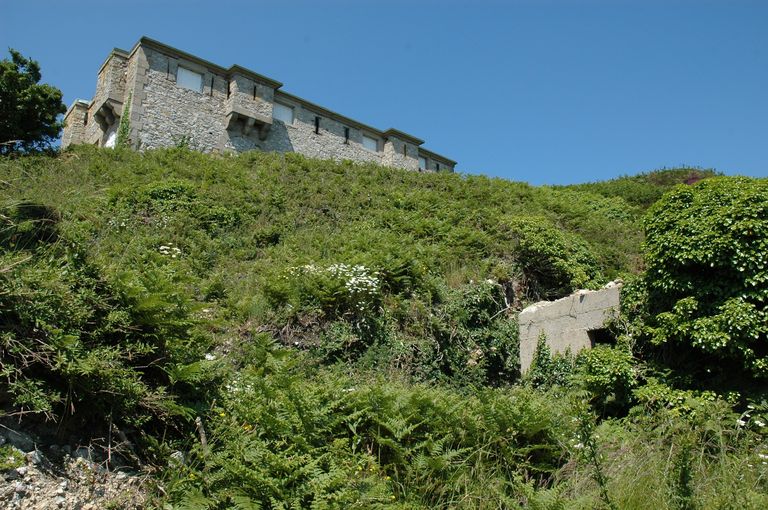 Vue de situation du corps de garde crénelé (état en 2005). Au premier plan : batterie de côte et abri en béton armé envahis par la végétationImmatriculation