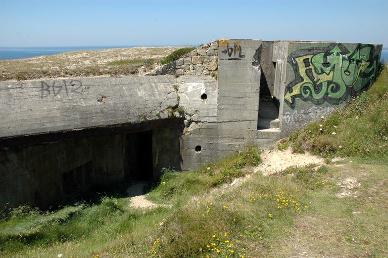Vue du bunker - poste de direction de tir de type 636a situé à l'extrémité de la pointe (état en 2005). A droite en position dominante, poste d'observation et de mitrailleuse dit Ringstand ou TobrukImmatriculation