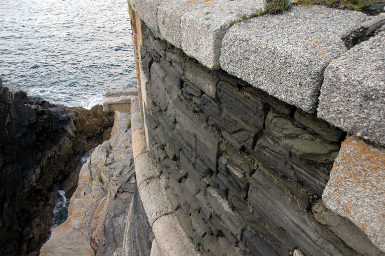 Vue de la batterie de Cornouaille : détail du parapet. Encadrement des créneaux, et cordon en granite ; remplissage en moellons de schisteImmatriculation