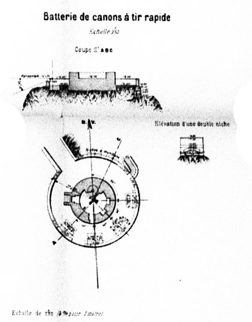 Plans et coupes des batterie casematée et à tir rapide, 1893 : détail de la batterie à tir rapide (Direction d'Artillerie du génie de Brest, colonel directeur d'Artillerie Collomb)Immatriculation