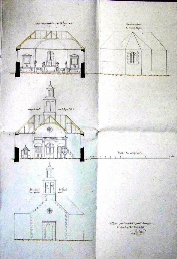 Coupes transversales et élévation ouest. Projet de reconstruction (1842) par Théodore Boyer (A. E. Quimper, fonds Bigot)Immatriculation