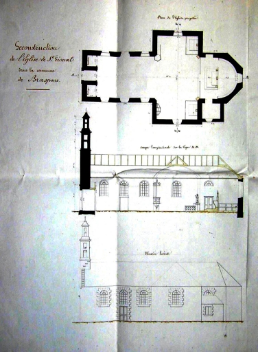 Saint-Rivoal, église paroissiale Saint-Rivoal : plan, coupe longitudinale et élévation sud. Projet de reconstruction (1842) par Théodore Boyer (A. E. Quimper, fonds Bigot), reproduction de 2005Immatriculation