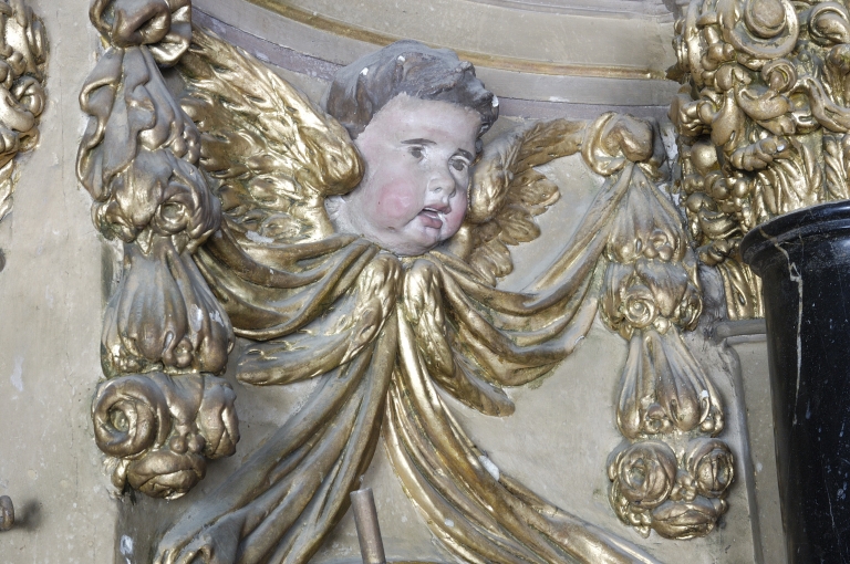 Retable, détail de l'angelot surmontant la niche latérale droiteImmatriculation