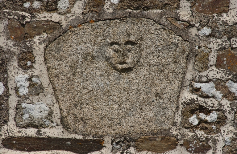Détail du visage sculpté en façadeImmatriculation