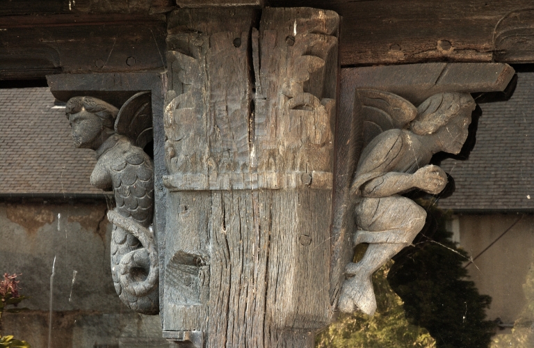 Elévation nord, poteau central à chapiteau feuillagé entre 2 aisseliers : ange à corps de sirène et ange portant une bouleImmatriculation
