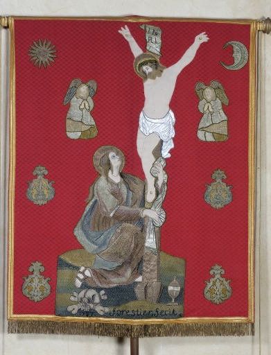Bannière de procession paroissiale : Saint Sulpice, Christ en croix avec Marie-Madeleine,