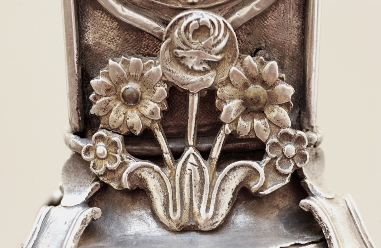 Croix de procession : avers, détail bouquet au pied de la croixImmatriculation