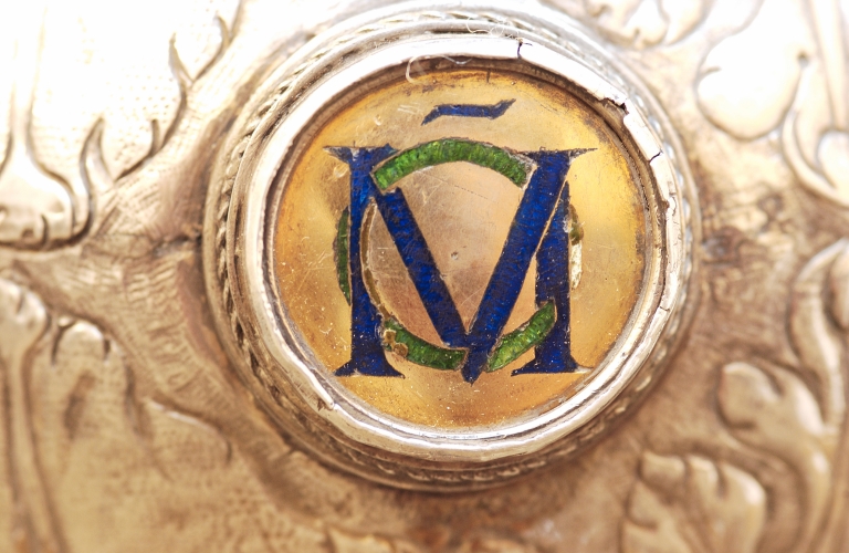 Croix de procession : bouton du noeud, lettres M OImmatriculation