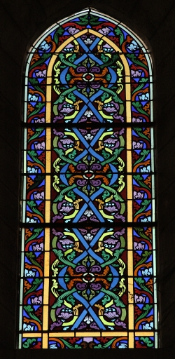 Verrières à personnages des baies 3 à 6, 8, 17 à 24, 100 à 104, 00 : Sacré Coeur, Saints Aubin, Louis, Pierre, Augustin, Jean, François d'Assise, Joachim, Michel, Immaculée Conception, Sainte Anne et verrières décoratives des baies 1, 2, 105 à 108,