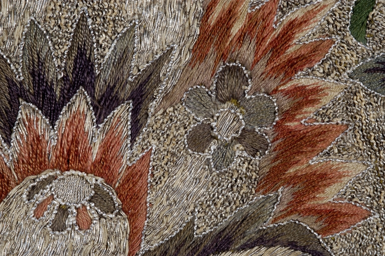 Dos de la chasuble : détail de la fleur de l'angle supérieur gauche de la croiséeImmatriculation