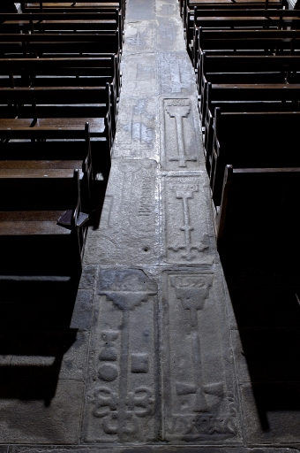 Dalles funéraires rassemblées dans l'allée centrale de la nefImmatriculation