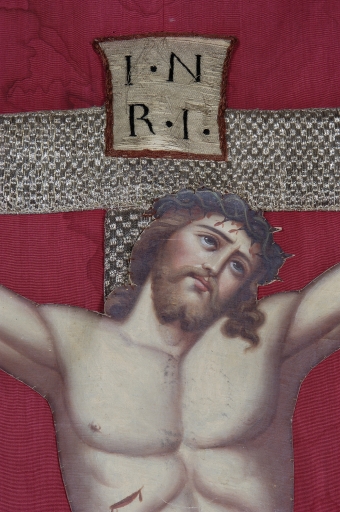 Bannière de procession, dite des prévots : Don du Rosaire, Christ en croix,