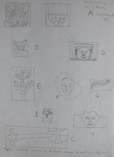 Dessin de 1971 représentant les différentes pierres sculptés se trouvant sur les bâtimentsImmatriculation