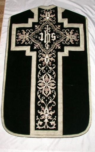 Ornement noir 1 : chasuble, étole, bourse de corporal, voile de calice et manipule,