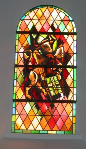 Verrières des baies 1 à 00 : Tétramorphe ; colombe ; blé ; vigne ; croix ; sainte Bernadette Soubirous,