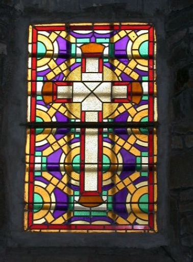 Verrières des baies 1 à 00 : Tétramorphe ; colombe ; blé ; vigne ; croix ; sainte Bernadette Soubirous,