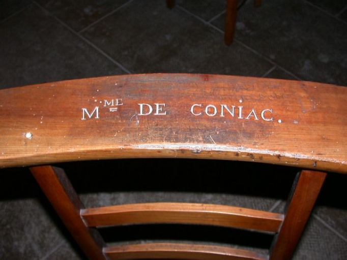 Vue rapprochée de l'inscriptin gravée sur la chaise : Mme ConiacImmatriculation