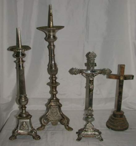 Séries de 8 et de 6 chandeliers d'autel, paire de croix d'autel, croix-reliquaireImmatriculation