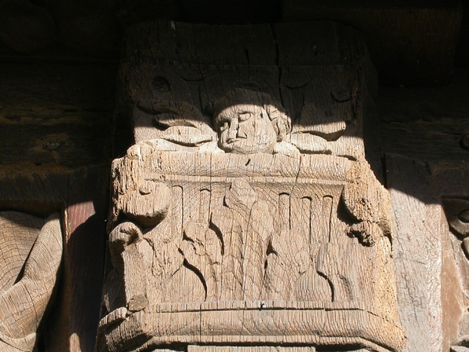 Chapiteau sculpté sur un poteau avec putti (état de 2005).Immatriculation