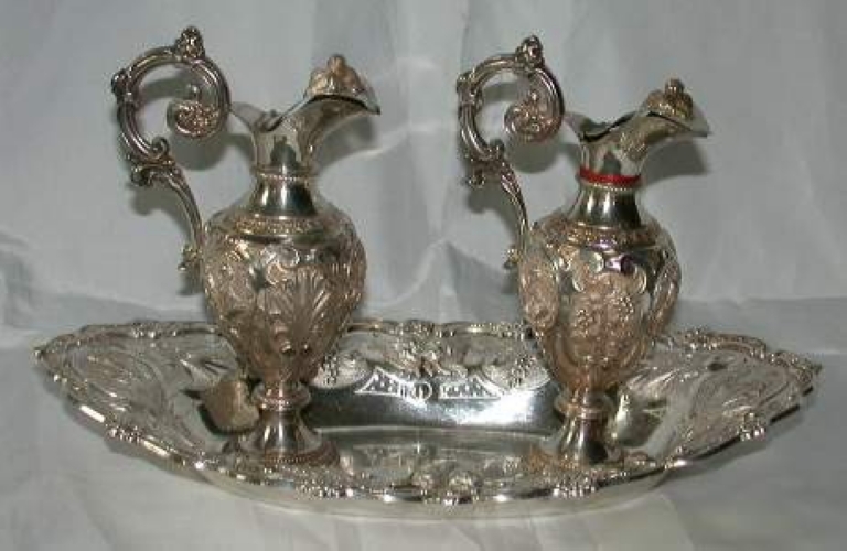 Paire de burettes et leur bassin, et une clochette,