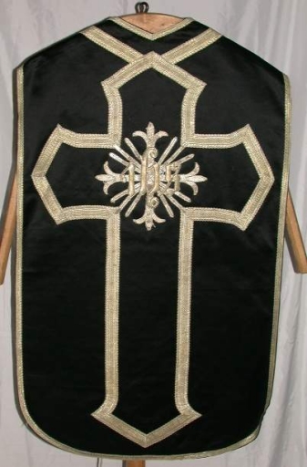 Ornement noir 1 : chasuble, bourse de corporal, étole, manipule, voile de calice,