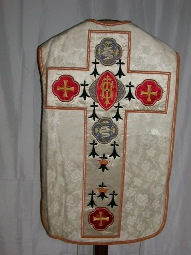 Ornement blanc 1 : chasuble, étole, manipule, bourse de corporal et voile de calice,