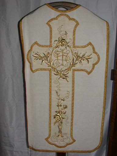 Ornement blanc 4 : chasuble, étole, manipule, bourse de corporal et voile de calice,