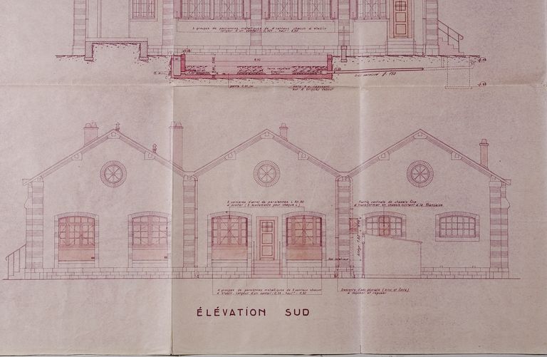 Halle grande vitesse (détruit). Réalisation de deux logements , élévations, détail, 23 octobre 1950. Archives de la SNCF, groupe études et bâtiments, Rennes.Immatriculation