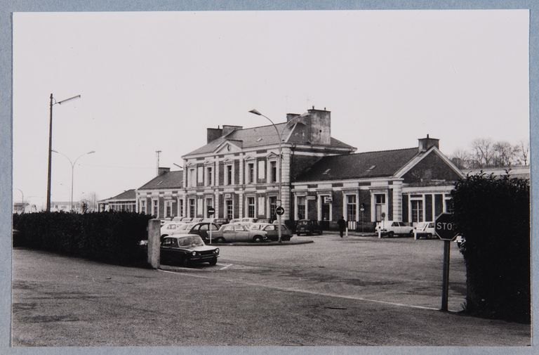 Vue générale sud-est du bâtiment des voyageurs, vers 1965. Archives de la SNCF, groupe études et bâtiments, Rennes.Immatriculation