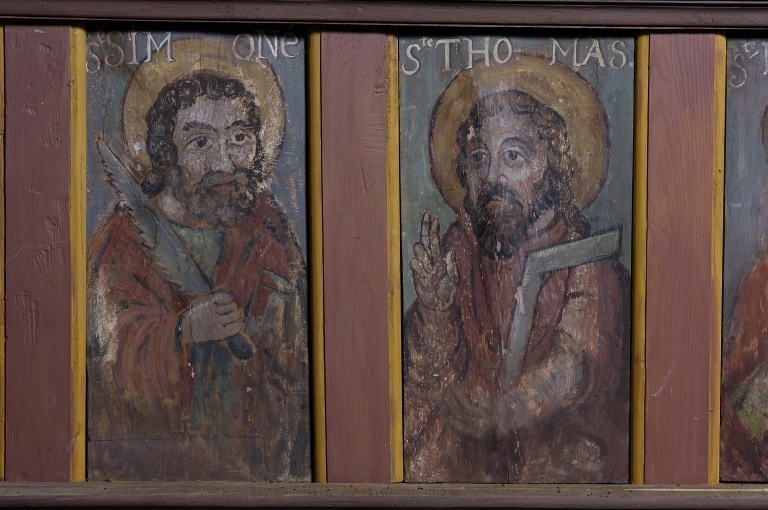 Clôture de choeur ; statues de la Vierge et de saint Jean au calvaire,