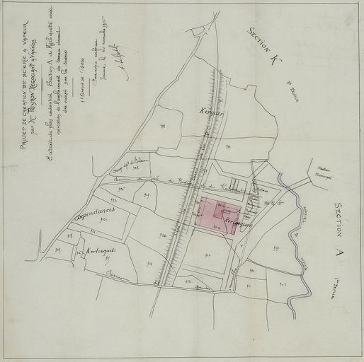 Extrait du plan cadastral section A. Indication du terrain devant être occupé par la scierie. Signe A. Le Gohlès, 30 novembre 1916. AD Morbihan, 5 M 232.Immatriculation