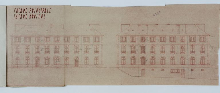 Transformation de l'ancienne infirmerie en HLM. Projet de Yves Guillou, 1949. Elévations projetées. AD Morbihan 110 J 4013.Immatriculation