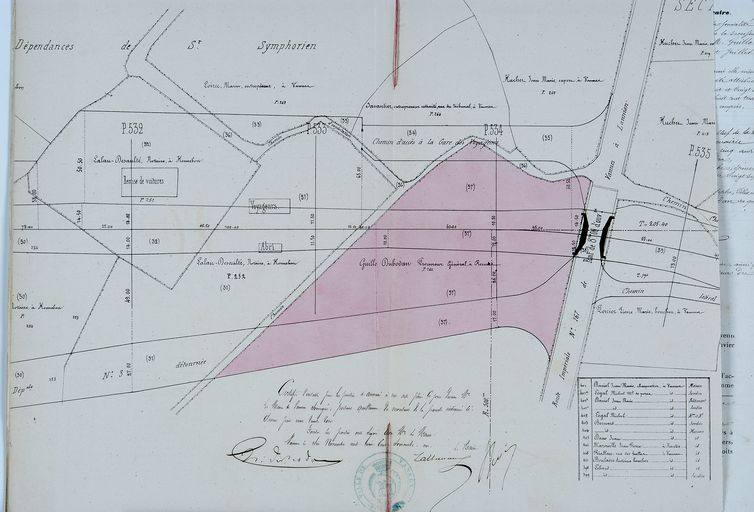 Voie ferrée. Plan des acquisitions dans la rue de la gare et route de Pontivy. Propriété de Guillo du Bodan, 1861.AD Morbihan S1315.Immatriculation